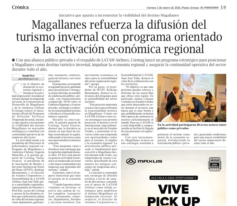 Con una alianza público-privada 🤜 🤛 y el respaldo de LATAM AIRLINES ✈️ , CORMAG lanzó un programa estratégico para posicionar a Magallanes como destino turístico invernal, impulsar la economía regional y asegurar la continuidad operativa del sector durante todo el año.